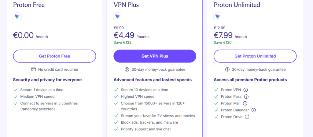 NordVPN doesn’t have a permanent free version, only a 30-day money-back trial. Proton offers a completely free tier, though with fewer features.